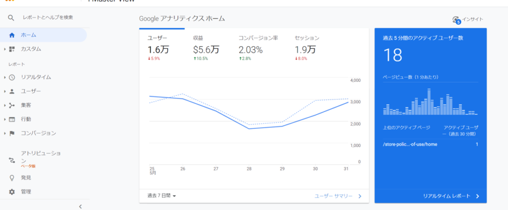 「Googleアナリティクス」を設定したら、下のようなグラフが見られるようになります。